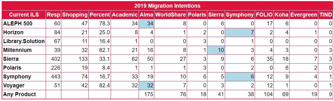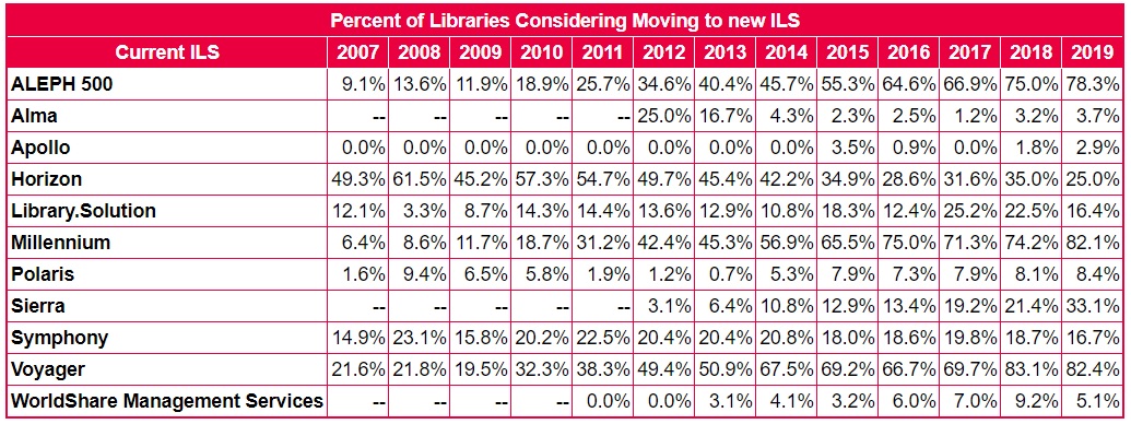 - 從傳統 ILS 系統轉換到 LSP 正如火如荼的進行著。大部份使用 Millennium、Voyager、Aleph 的圖書館表示正考慮轉換到新系統。使用這些舊產品的圖書館數量繼續且迅速地減少中。