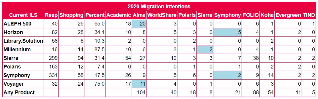- 在公共圖書館領域較有優勢的傳統 ILS,其用戶對更換新系統的興趣不大。在想要更換的圖書館中,目標產品獲得青睞的比例分別為 Symphony (17%)、Horizon (34%)、 Polaris (7.3%)、Library.Solution (10.3%)、Sierra (31%)、VERSO (9.8%)。