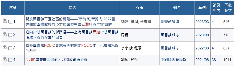 上海圖書館於2022年正式啟用 FOLIO,並早在 2021年就與上海交通大學圖書館、江蘇嘉圖網路科技公司建立智慧圖書館技術應用聯盟 (云瀚聯盟),為加速系統的推廣及轉換做準備。目前這個聯盟30個圖書館成員中有公共圖書館,也有大學圖書館,不乏知名的圖書館,相信未來會有更多圖書館改用 FOLIO。