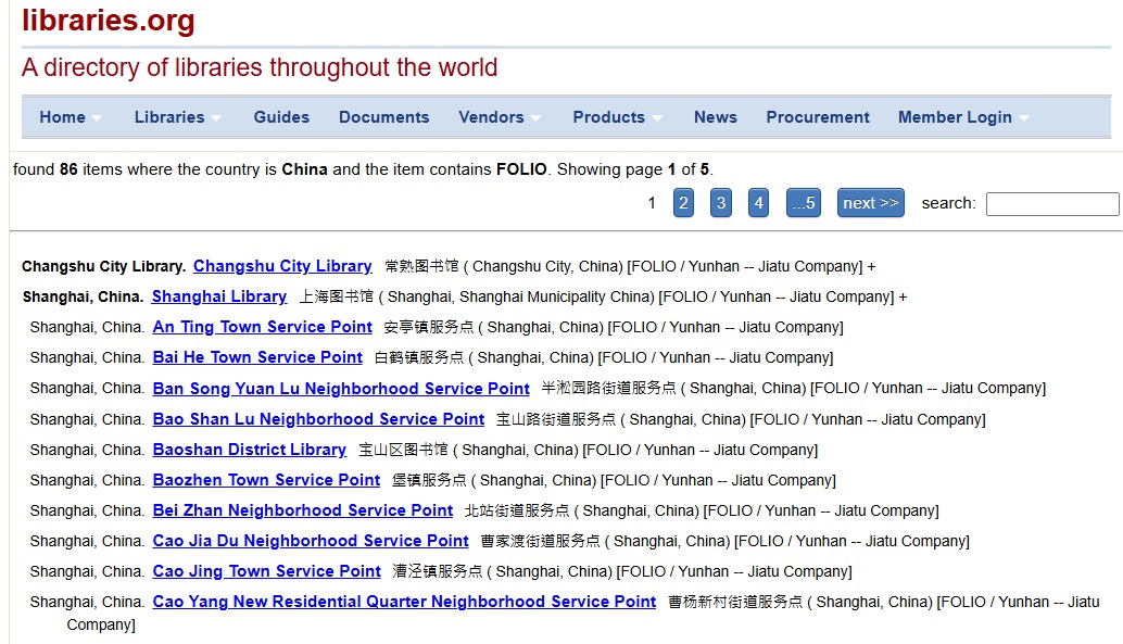 在 LTG > Products 以 FOLIO 查詢後可以在 Distribution of FOLIO sites by Country 看到中國有86個 Yunhan FOLIO 安裝數 。除了常熟圖書館外,其餘都是上海地區的圖書館及街道服務點,從之前本站分享的訊息中可以看出,上海圖書館應該是扮演了主導的角色[2, 3]。