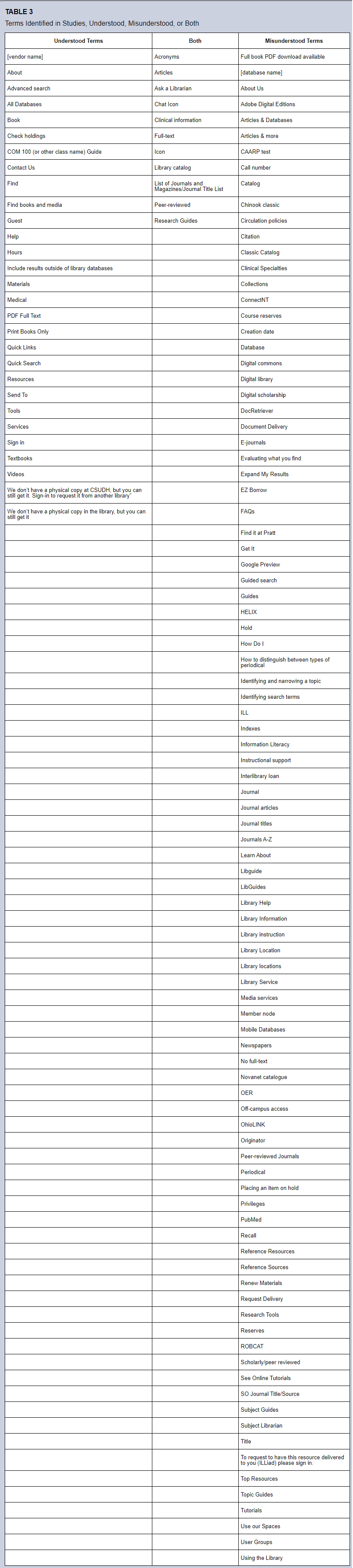 下面是文中 Table 3 的部分截圖(點擊可以看全部),內容按字母排序。我覺得很不可思議,有些用語應該很好理解才對,倒是 Call number(索書號)、Catalog 與 Articles & Databases 的區別、Peer-reviewed(同儕評閱)是比較有可能看不懂的。