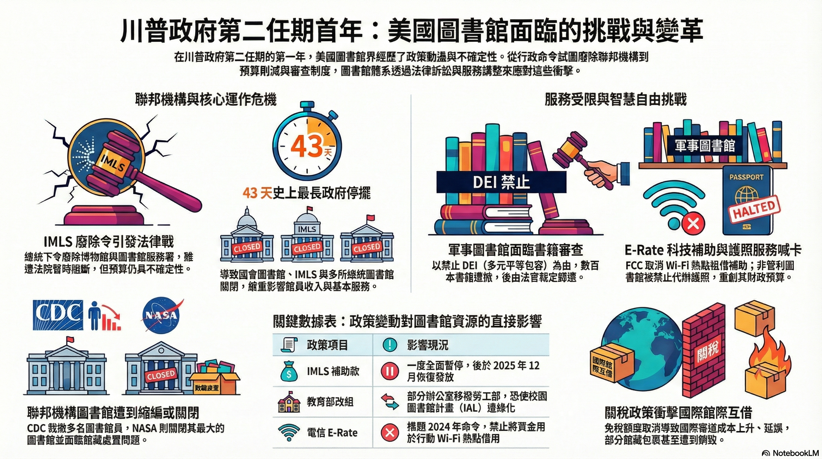過去一年,川普政府在經濟與地緣政治上的舉措引發全球熱議,而這股影響力也正延伸至美國的圖書館體系。本文摘錄《American Libraries Magazine》一月底的報導精華,透過資訊圖表形式,助你快速掌握川普政策對美國圖書館界造成的關鍵影響。