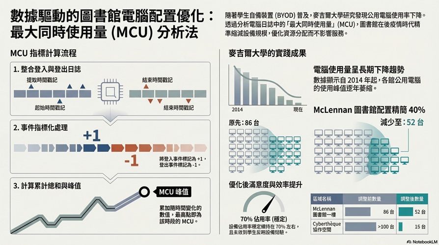 這篇研究探討了麥吉爾大學(McGill University)圖書館在後疫情時代,如何透過最大同時使用量(maximum concurrent usage)這一量化指標,科學地調整館內公共電腦的配置數量。作者指出,隨著學生自備裝置(BYOD)的普及以及對公共設施衛生習慣的改變,傳統固定式電腦的需求已逐年下降,長期導致了空間與維護成本的浪費。
